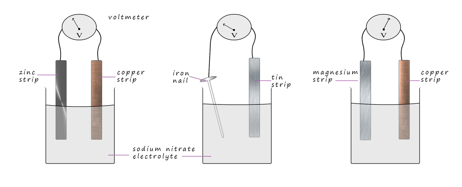 The image below shows three cells; in each cell there are two different metals dipped in a sodium nitrate electrolyte. In each cell there is a flow of electrons; that is an electrical current; from the metal highest in the reactivity series to the metal lowest in the reactivity series. The most reactive metal in the cell will form the negatively charged electrode; the anode; while the least reactive metal will form the positively charged electrode; the cathode in the cell.