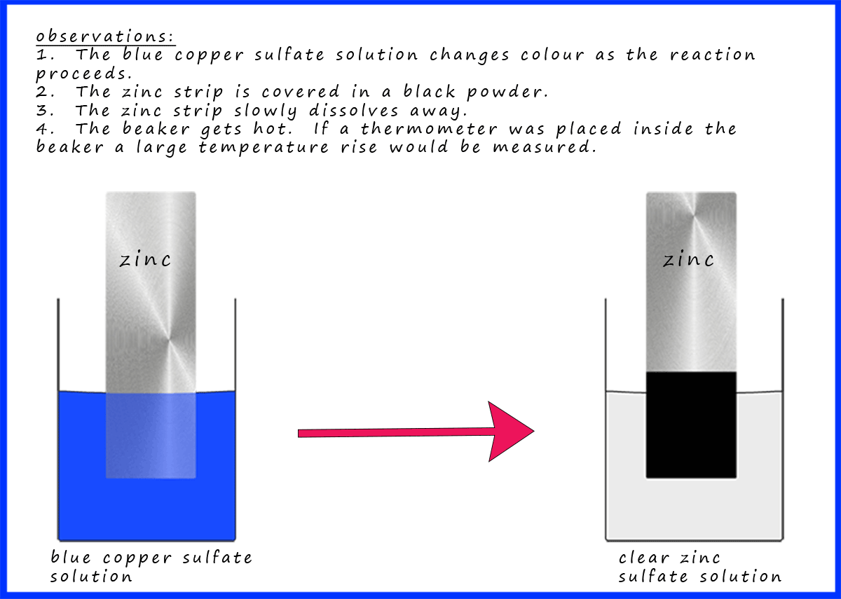solution slowly fades and to form a clear zinc sulfate solution. This reaction is a metal displacement reaction but it is also a redox reaction. Recall that a redox reaction is one where both reduction and